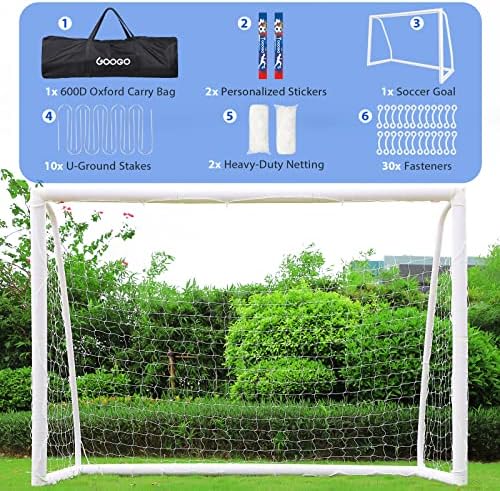Simple Setup & High Stability: Our soccer goals feature a fast locking system that precision fit locking pins and provides strength and stability. Included installation drawings aid a simple secure assembly process of the soccer goal. An adult or even a kid can complete the installation alone. The goal comes with 10 x U-ground stakes that won’t easily deform, or crack to increase the stability during use. So it is absolutely impossible for the soccer goal to flip over.