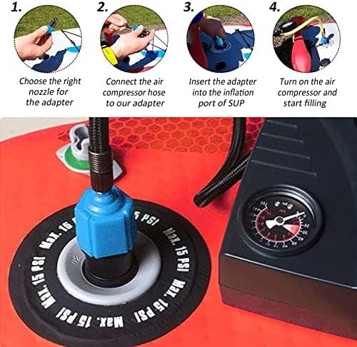 Easy to use: Choose the right nozzle for the adapter. Connect the air compressor hose to our adapter. Insert the adapter into the inflation port of SUP. Turn on the air compressor and start filling.